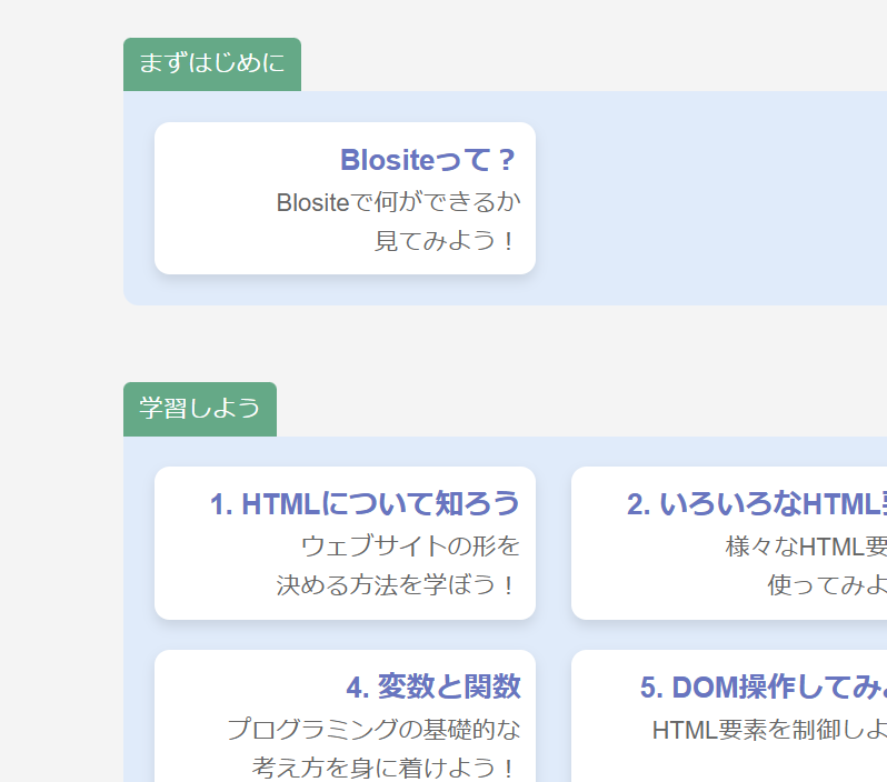 まずはチュートリアル一覧に移動して、「Blositeって?」というチュートリアルをやりましょう!その後は他のチュートリアルを進めたり、サンドボックスで自由に作ったり、他の人が作ったサイトを見たりしてみましょう!